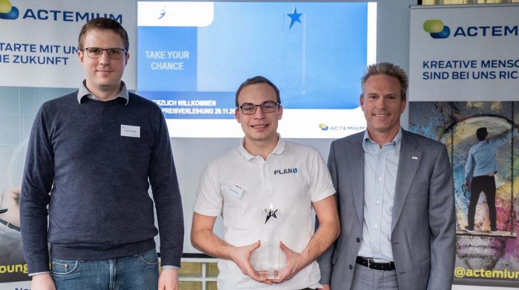 Bild: Patrick Strittmatter (young@actemium), Simon Helfenfinger (Gewinner), Patrick Vergult (Managing Director Actemium Schweiz AG)